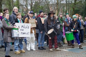 Under grey, misting clouds, over 100 Galwegians gathered outside City Hall at a recent protest…