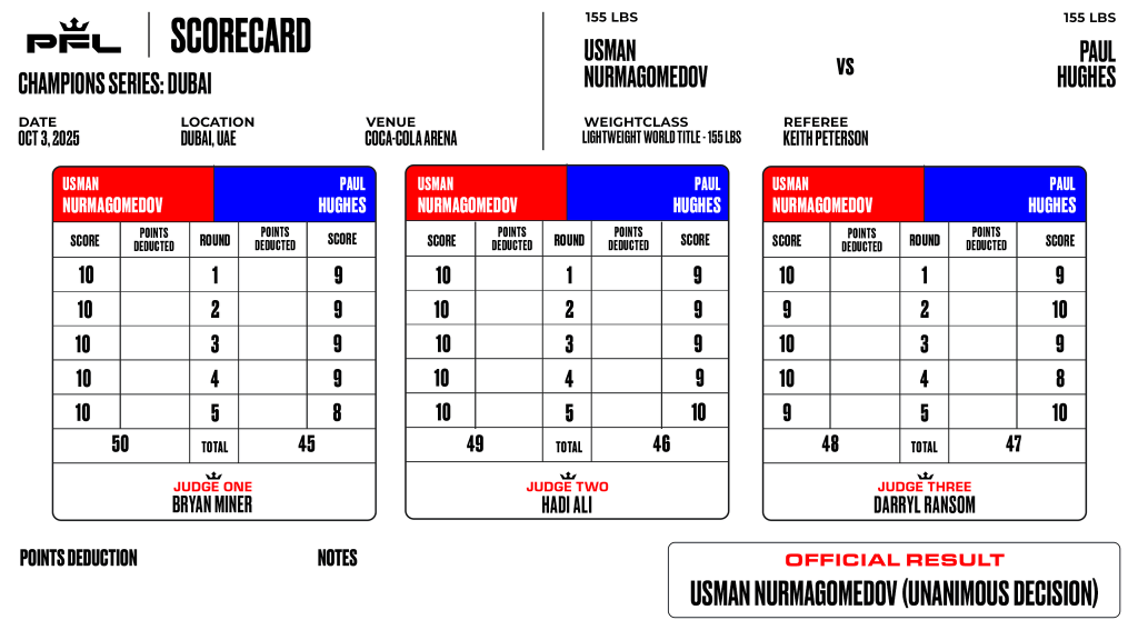 A since-deleted Nurmagomedov vs. Hughes scorecard featuring two scoring errors. Source: PFL PR
